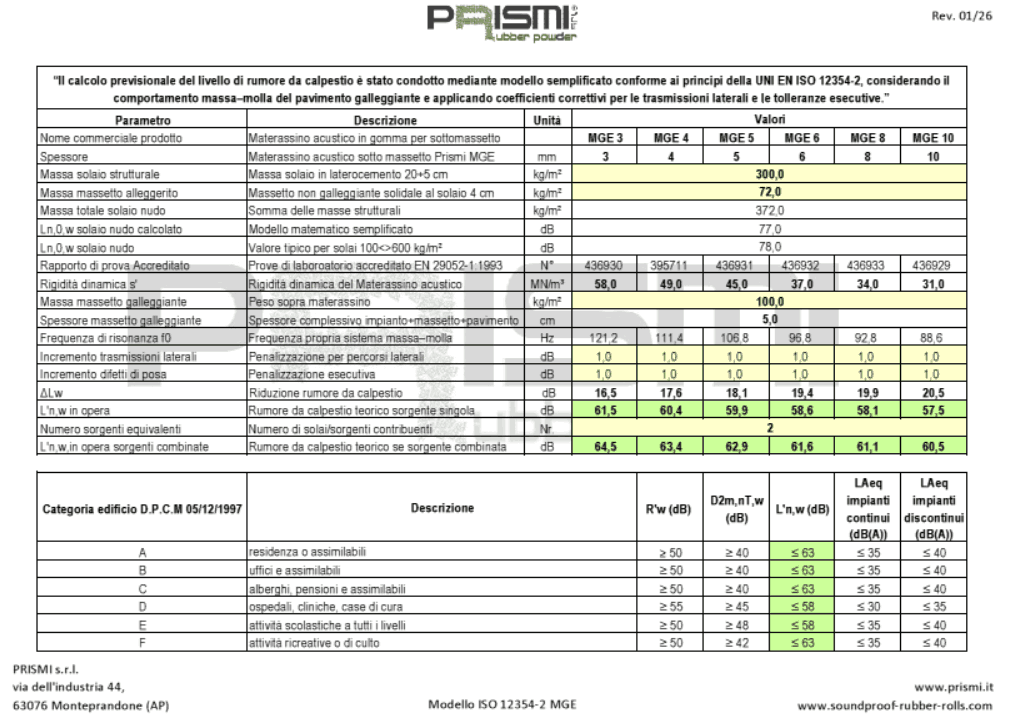 Este artículo presenta un modelo de cálculo predictivo basado en la norma UNI EN ISO 12354-2 para estimar el nivel de ruido de impacto in situ L’n,w en edificios residenciales utilizando las láminas acústicas de caucho reciclado certificadas PRISMI MGE.